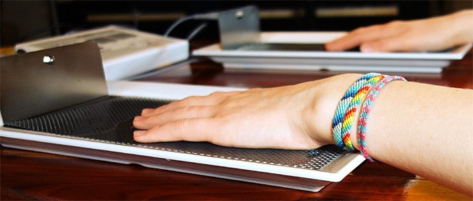 Raise your sitting position and assume a natural, relaxed posture. Place the tubs directly beside your body. With a little practice, you will find a good and comfortable treatment position. In our picture, the iontophoresis user is sitting on a piano stool and protects her wrists by using the edge protection, which can be placed over the rim of the tubs. Her sitting position is straight, but easygoing.