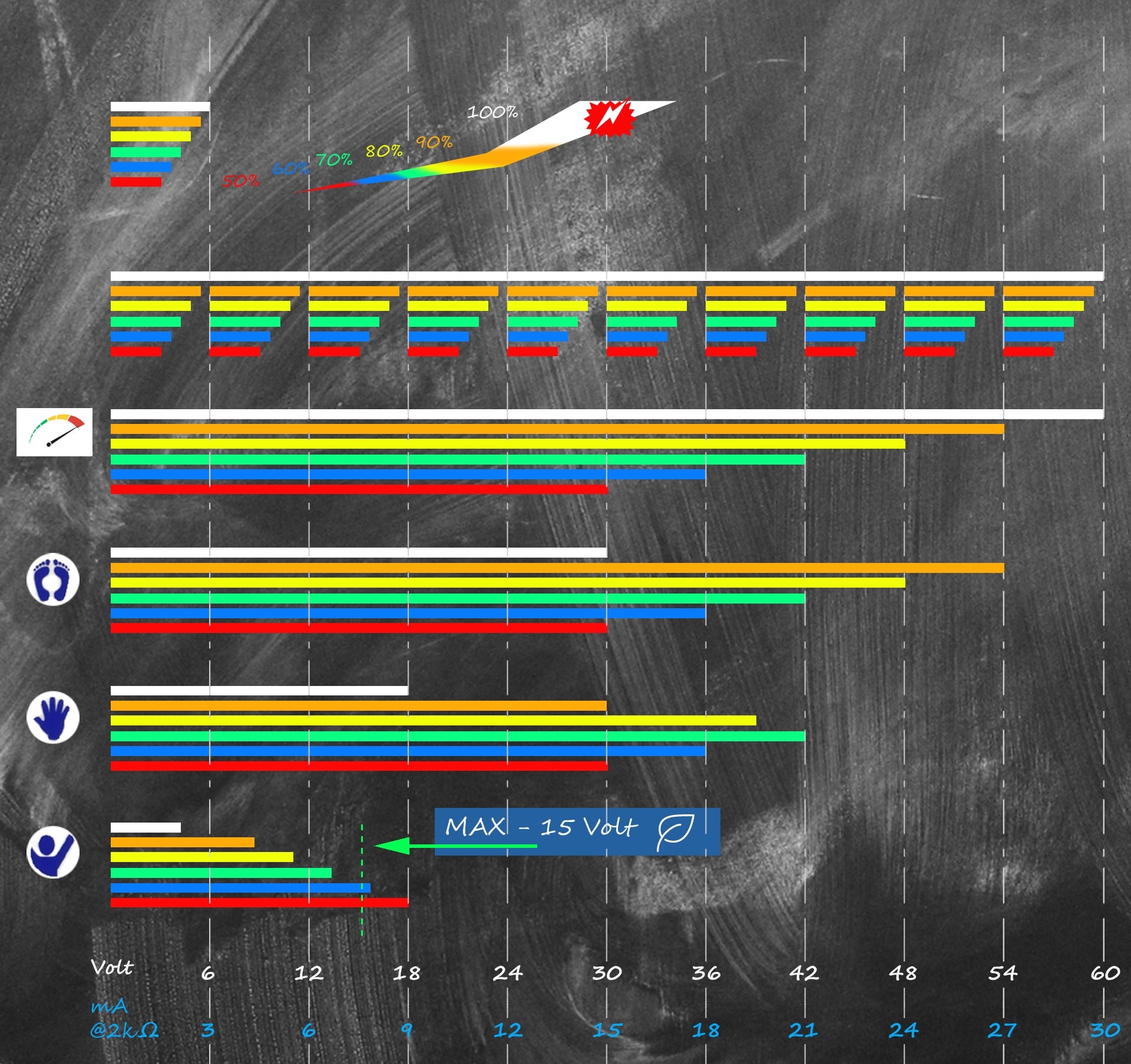 Für die Achseln: Hier kommt die empfohlene Begrenzung des Herstellers ins Spiel. Mit Gleichstrom wurde vom Team-Tester ein Wert unter 6 Volt als tolerierbar bezeichnet. Mit 50 % Pulsbreite würde man in unserem Beispiel über der maximal empfohlenen Strommenge liegen, wenn man den Strom voll aufdreht, mit 60% liegt man schon ziemlich genau richtig - aber auch in diesem Fall darf die Stromstärke maximal auf 15V gestellt werden. Ab 60 Prozent aufwärts konnte weniger Strom aushalten.