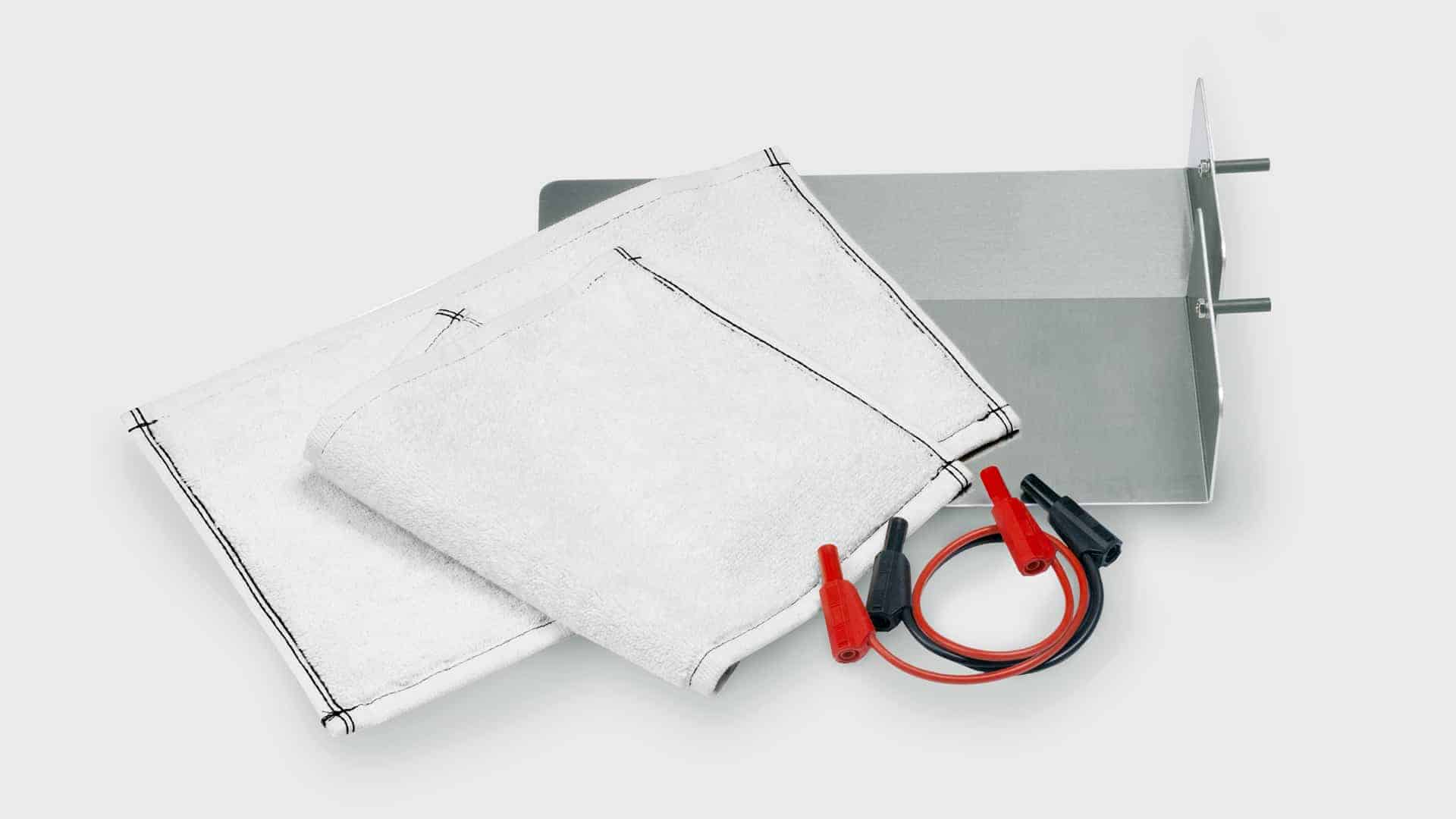 Das Set DUO beinhaltet: 2 Y-Kabel mit 4mm Labor-Stecker, 2 Behandlungstücher, Maschinenwaschbar - Kochwäsche